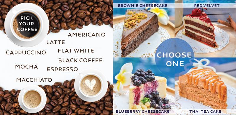 Make the perfect blend with one of our four succulent cakes ( Red Velvet – Thai Tea Cake – Chocolate Brownie and Blueberry Cheesecake) combine to your preferred coffee ( Latte -Mocha – Espresso – Americano – Cappuccino – Flat White – Macchiato or Black). Take it by the pool or at the relaxing V Lounge and let them melt in your mouth.⠀